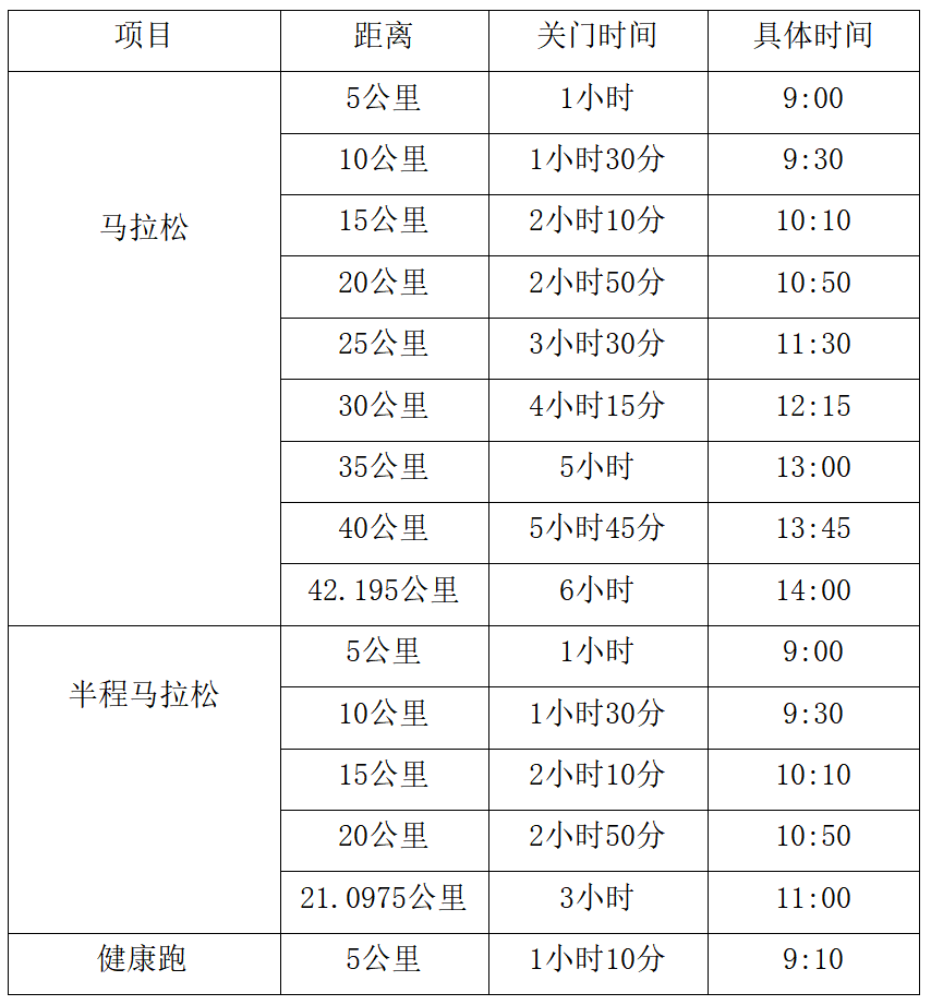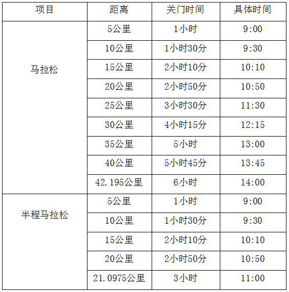 为了保证参赛运动员比赛安全、顺利,比赛期间比赛路线各段设关门时间,限时对交通封闭。起跑至关门时间到后,各路段恢复社会交通。参赛运动员在规定的关门时间内未跑完对应距离的参赛运动员须立即停止比赛,退出赛道,以免发生危险。退出比赛选手可乘坐组委会提供的收容车到相应项目的终点。否则由此引发的事故将由参赛运动员自行承担相应法律责任和赔偿责任。
