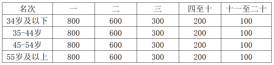 3、如同时获得多项个人奖励,则只奖励最高奖项,不重复累加奖励;且后面的名次不做递补。年龄分组奖根据年龄周岁计算。